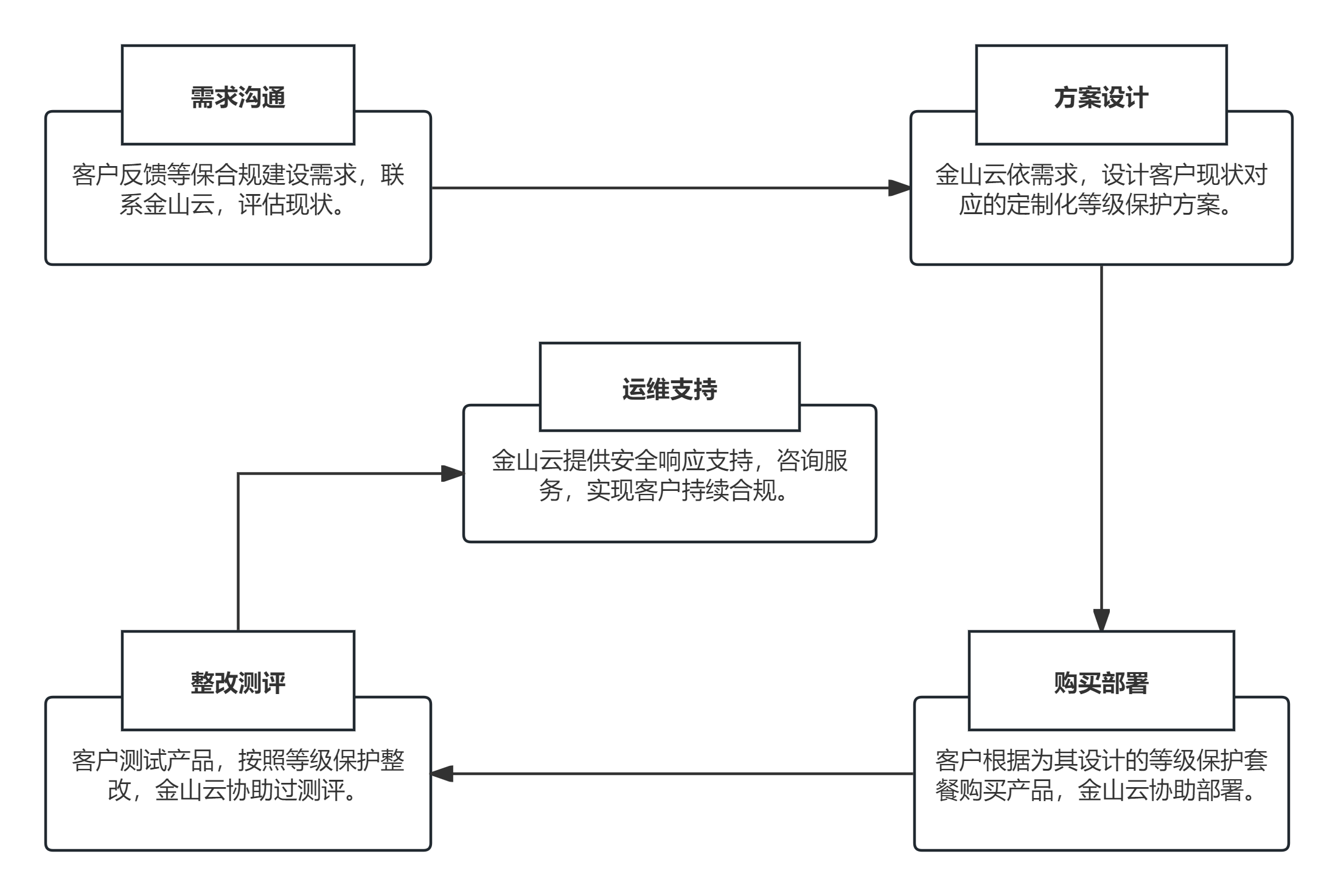 客戶通過官網(wǎng)、熱線聯(lián)系金山云溝通等級保護合規(guī)需求,安全顧問深入了解其行業(yè)、業(yè)務(wù)系統(tǒng)等情況,初評安全現(xiàn)狀并識別風險差距;再結(jié)合客戶情況與產(chǎn)品體系,設(shè)計個性化方案,分場景推薦等級保護二、三級套餐。